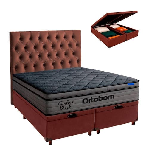 Baú Marrom + Cabeceira + Colchão King Confort Black Ortobom Conjunto King Colchão Confort Black + Cama Box Bau Marrom + Cabeceira O Colchão Confort Black Ortobom une tecnologia e conforto para um sono de qualidade. Conta com pillow top em espuma D28 selada, que garante maciez, resiliência e durabilidade. Sua estrutura interna em EPS de alta resistência oferece suporte firme e estável, mantendo a ergonomia ideal.