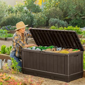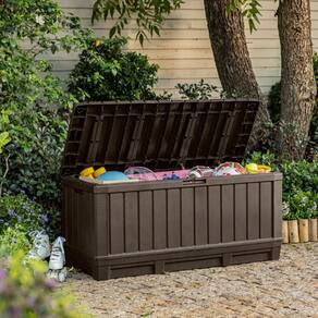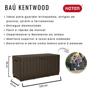 Uma incrível solução de armazenamento de ótima qualidade que também se converte em assento para dois adultos. O baú de armazenamento Kentwood lhe oferece um acabamento com aparência de madeira que complementa qualquer decoração externa. Tem capacidade total de 350L em seu interior, medindo 59 cm de altura, 53.6 cm de largura e 128 cm de comprimento, para você armazenar todos os tipos de objetos. O Baú Kentowood é uma solução ideal para manter o seu quintal organizado e arrumado, com muito espaço para coisas como almofadas de cadeiras, jogos ao ar livre e ferramentas de jardinagem. Fácil de montar, não requer o uso de ferramentas especiais, é feito de material de resina durável, resistente às intempéries e livre de manutenção por anos de uso.