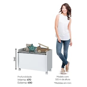 Baú espaçoso, com rodinhas para fácil movimentação e tampo com pistão a gás para segurança.