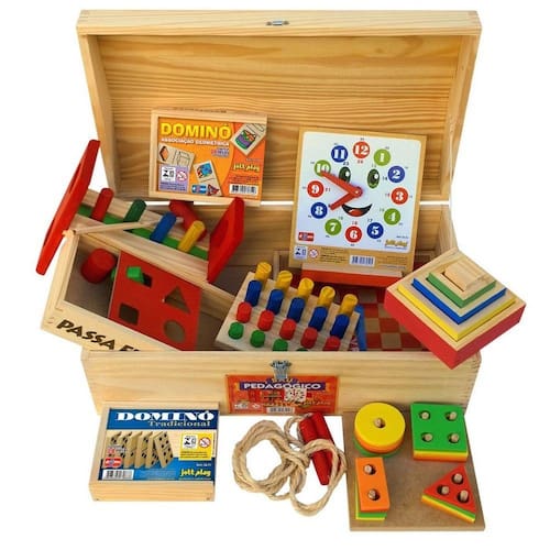 Baú de madeira com dobradiças e fecho, medindo 50x32x25xcm. Acompanha 10 brinquedos: dominó de formas geométricas, jogo de pinos, prancha de seleção, relógio, bate pinos, passa figuras, dominó tradicional, cubos de encaixe, pula corda e palavras cruzadas. Obs.: sobra espaço para colocar mais brinquedos. CE-BRI/ICEPEX - N 00928-96