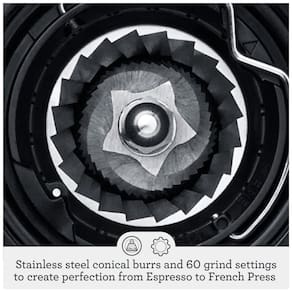 Brocas cônicas de aço inoxidável projetadas para minimizar o calor de moagem e proteger os óleos essenciais no grão de café 60 configurações de moagem precisas, desde o melhor expresso até a moagem francesa mais grossa O temporizador eletrônico de precisão permite que os usuários ajustem o tempo de moagem em incrementos de 1 segundo e uma dose consistente a cada vez Capacidade de grãos de café de 12 onças, 354ml com sistema de travamento para fácil remoção, zenamento e transferência do funil de grãos Moa diretamente no filtro porta, recipiente de trituração, cesta de filtro de tom dourado ou filtro de papel