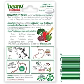 Os comprimidos podem ser mastigados ou engolidos com água.Tome Beano conforme as instruções ao comer alimentos que podem causar gases.