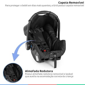 A Grid ainda conta diversas características que a deixam ainda mais atrativa, como capota removível e lavável que protege o bebê contra os raios de sol, almofada redutora removível e lavável que auxilia na acomodação correta da criança. Se você busca custo-benefício, segurança, versatilidade e conforto para seu bebê a Grid superará suas expectativas!