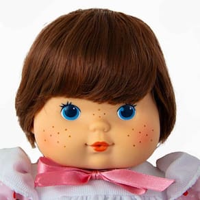 Sua cabeça, braços e pernas são feitos de vinil, enquanto seu rostinho encantador é decorado com olhos brilhantes e um sorriso doce.