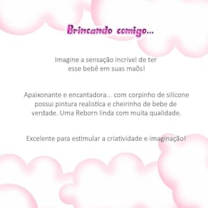 A nossa empresa tem a missão de garantir a total satisfação de seus clientes, onde a qualidade e o atendimento excepcional são nossa prioridade Estamos muito felizes em apresentar a Boneca Bebê Reborn para você, um item cuidadosamente selecionado para atender às suas necessidades. Compre agora e experimente a diferença em comprar com a nossa empresa.A Boneca Bebê Reborn é o sonho das meninas Produzida 100% em vinil siliconado, essa boneca pode sentar, deitar e fazer tudo que a sua imaginação deixar. Com seus olhos castanhos e cabelos implantados ela é encantadora e apaixonante. Sua criança merece a melhor qualidade de bebê reborn Marca: Cegonha Reborn DollsModelo: Boneca Bebê RebornCor: BegeMaterial: Vinil Siliconado AtóxicoCaracterísticas principais: Membros Articulados, Corpo de Silicone, Detalhes Realistas.Medidas Aprox.: Altura da Boneca: 52cm Peso Aprox. Da Boneca: 0,745 Kg Certificado INMETRO Recomendado para crianças maiores de 03 anosConteúdo: 01 Bebê Reborn Cabeça, Membros e Corpo de Vinil 01 Conjunto Macacão e Vestido 01 Mamadeira 01 Escova de Cabelo 01 Pente 01 Chupeta Magnética 01 Certidão de Nascimento 01 Manual de Cuidados 01 Certidão de Vacinas 01 Exame do Pézinho 01 Prendedor de Chupeta 01 Kit com 3 Fraldas 01 Bolsa Maternidade 01 Laço de Cetim Garantia30 dias de garantia oferecida pelo fabricante.Dúvidas Frequentes:1. O Cabelo é implantado mesmo ou perucaR. O cabelo da boneca Bailarina é totalmente implantado.2. Ela emite algum somR. Não, ela não emite nenhum som.3. Pode dar banho na bonecaR. Sim, pois o material do corpo é de Silicone.4. O cabelo pode ser penteadoR. Sim, o cabelo da boneca pode ser suavemente escovado e penteado.Tags: boneca, bebe, reborn, realista, menina, infantil, silicone, princesa, linda, fofa, banho , enxoval, completo, presente, grande, baby alive.