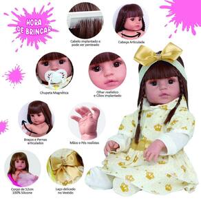 A Boneca Bebê Reborn é o sonho das meninas Produzida 100% em vinil siliconado, essa boneca pode sentar, deitar e fazer tudo que a sua imaginação deixar. Com seus olhos castanhos e cabelos implantados ela é encantadora e apaixonante. Sua criança merece a melhor qualidade de bebê reborn
