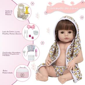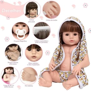 A nossa empresa tem a missão de garantir a total satisfação de seus clientes, onde a qualidade e o atendimento excepcional são nossa prioridade Estamos muito felizes em apresentar a Boneca Bebê Reborn para você, um item cuidadosamente selecionado para atender às suas necessidades. Compre agora e experimente a diferença em comprar com a nossa loja. A Boneca Bebê Reborn é o sonho das crianças Produzida 100% em vinil siliconado, essa boneca pode sentar, deitar e fazer tudo que a sua imaginação deixar. Com seus olhos castanhos e detalhes realistas ela é encantadora e apaixonante. Sua criança merece a melhor qualidade de bebê reborn Marca: Cegonha Reborn Dolls Modelo: Boneca Bebê Reborn Cor: Bege Material: Vinil Siliconado Atóxico Características Principais: Membros Articulados, Corpo de Silicone, Detalhes Realistas. Medidas Aprox.: Altura da Boneca: 46cm Peso Aprox. Da Boneca: 0,745 Kg Certificado INMETRO Recomendado para crianças maiores de 03 anos Conteúdo: 1 Bebê Reborn Cabeça, Membros e Corpo de Vinil 1 Saída de Banho Girafa 1 Par de Cílios 1 Par de Brinco 1 Chupeta 1 Mamadeira Simples 5 Certificados 3 Fraldas 1 Laço Cetim 2 Presilhinha 1 Par de Luvas 1 Bolsa Maternidade 1 Prendedor de Chupeta Kit Pente e Escova Simples 1 Pelúcia cor 30 dias de oferecida pelo fabricante. Dúvidas Frequentes: 1. Ela acompanha Itens R. Sim, todos os itens da descrição. 2. Ela emite algum som R. Não, ela não emite nenhum som. 3. Pode dar banho na boneca R. Sim, pois o material do corpo é de Silicone. 4. Pode escolher a cor dos olhos da boneca R. Não, os olhos já vêm de fábrica. Tags: Realista, Menina, Infantil, Silicone, Princesa, Linda, Morena, Loira, Fofa, Banho, Enxoval, Completo, Grande. Homologação Inmetro: IP-BRI-0099/2022-06