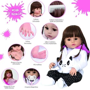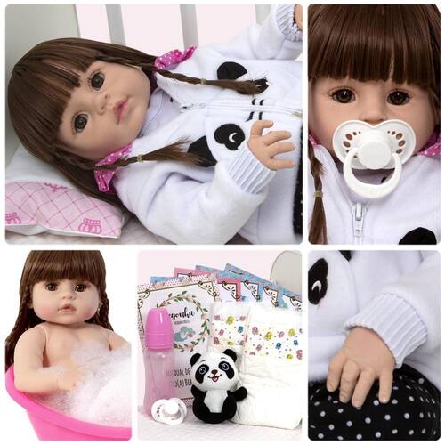A Boneca Bebê Reborn Pandinha é o sonho das meninas Produzida 100% em vinil siliconado, essa boneca pode sentar, deitar e fazer tudo que a sua imaginação deixar. Com seus olhos castanhos e detalhes realistas ela é encantadora e apaixonante. Sua criança merece a melhor qualidade de bebê reborn