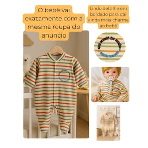 Ele vai com a roupinha exatamente como está na foto (Roupa fabricada sob medida exclusivamente para nossos bebês) Um lindo macacão com detalhes em bordado.