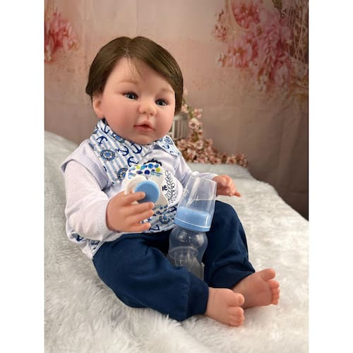Nossos bebês são confeccionados com o mais alto padrão de qualidade em vinil siliconado e tecido macio. Os olhos azuis brilhantes garantem uma aparência encantadora e realista.