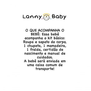 O QUE ACOMPANHA O BEBÊ: Essa bebê acompanha o kit básico: Roupa e sapato do corpo, 1 chupeta, 1 mamadeira, 1 fralda, certidão de nascimento e manual de cuidados.