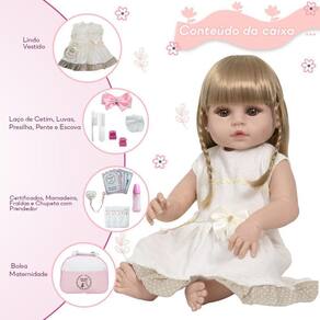 A Boneca Bebê Reborn é o sonho das crianças Produzida 100% em vinil siliconado, essa boneca pode sentar, deitar e fazer tudo que a sua imaginação deixar. Com seus olhos castanhos e detalhes realistas ela é encantadora e apaixonante. Sua criança merece a melhor qualidade de bebê reborn