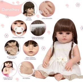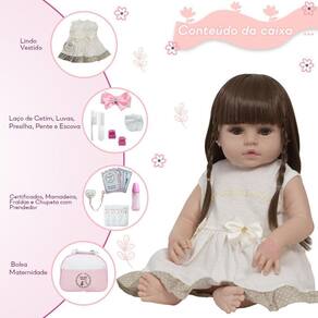 A Boneca Bebê Reborn é o sonho das crianças Produzida 100% em vinil siliconado, essa boneca pode sentar, deitar e fazer tudo que a sua imaginação deixar. Com seus olhos castanhos e detalhes realistas ela é encantadora e apaixonante. Sua criança merece a melhor qualidade de bebê reborn