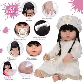 A Boneca Bebê Reborn é o sonho das meninas Produzida 100% em vinil siliconado, essa boneca pode sentar, deitar e fazer tudo que a sua imaginação deixar. Com seus olhos castanhos e detalhes realistas ela é encantadora e apaixonante. Sua criança merece a melhor qualidade de bebê reborn