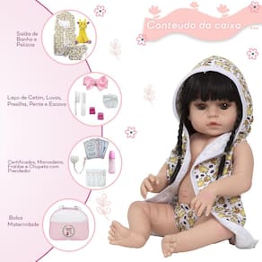A nossa empresa tem a missão de garantir a total satisfação de seus clientes, onde a qualidade e o atendimento excepcional são nossa prioridade Estamos muito felizes em apresentar a Boneca Bebê Reborn para você, um item cuidadosamente selecionado para atender às suas necessidades. Compre agora e experimente a diferença em comprar com a nossa loja. A Boneca Bebê Reborn é o sonho das crianças Produzida 100% em vinil siliconado, essa boneca pode sentar, deitar e fazer tudo que a sua imaginação deixar. Com seus olhos castanhos e detalhes realistas ela é encantadora e apaixonante. Sua criança merece a melhor qualidade de bebê reborn Marca: Cegonha Reborn Dolls Modelo: Boneca Bebê Reborn Cor: Bege Material: Vinil Siliconado Atóxico Características Principais: Membros Articulados, Corpo de Silicone, Detalhes Realistas. Medidas Aprox.: Altura da Boneca: 46cm Peso Aprox. Da Boneca: 0,745 Kg Certificado INMETRO Recomendado para crianças maiores de 03 anos Conteúdo: 1 Bebê Reborn Cabeça, Membros e Corpo de Vinil 1 Saída de Banho Girafa 1 Par de Cílios 1 Par de Brinco 1 Chupeta 1 Mamadeira Simples 5 Certificados 3 Fraldas 1 Laço Cetim 2 Presilhinha 1 Par de Luvas 1 Bolsa Maternidade 1 Prendedor de Chupeta Kit Pente e Escova Simples 1 Pelúcia cor 30 dias de oferecida pelo fabricante. Dúvidas Frequentes: 1. Ela acompanha Itens R. Sim, todos os itens da descrição. 2. Ela emite algum som R. Não, ela não emite nenhum som. 3. Pode dar banho na boneca R. Sim, pois o material do corpo é de Silicone. 4. Pode escolher a cor dos olhos da boneca R. Não, os olhos já vêm de fábrica. Tags: Realista, Menina, Infantil, Silicone, Princesa, Linda, Morena, Loira, Fofa, Banho, Enxoval, Completo, Grande. Homologação Inmetro: IP-BRI-0099/2022-06