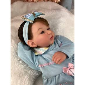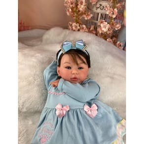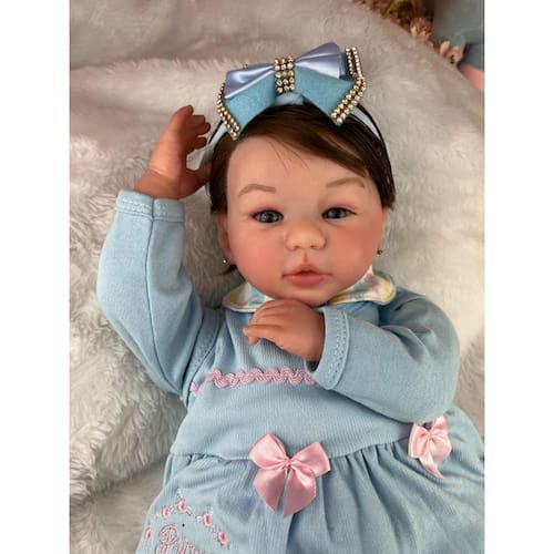 Nossos bebês são confeccionados com o mais alto padrão de qualidade em vinil siliconado e tecido macio. Os olhos azuis brilhantes garantem uma aparência encantadora e realista.