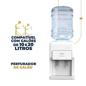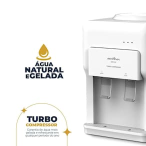 Temperatura da água: Natural 16°C e Gelada 6° a 12°C 2 saídas de água Tipo de gás: R600a Resfriamento por compressor Bandeja coletora removível Luz indicadora de funcionamento e água gelada Capacidade de refrigeração: 1,1 Litros por hora Capacidade do reservatório interno: 0,8 Litro Potência: 160W (127V) e 110W (220V) Tensão/Hz: 127V (60Hz) e 220V (60Hz) Comporta garrafões de até 20L.