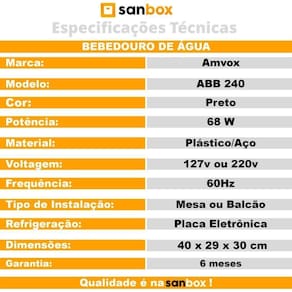 Bebedouro De Água Eletrônico 20L Amvox Abb 240 Black- 68WO Bebedouro de água Gelada Eletrônico Bivolt 20L 60Hz Amvox ABB 240 Black- 68W é perfeito para os dias de extremo calor, com ele você pode se refrescar com opções de agua natural ou gelada, sendo extremamente prático e fácil de usar. Bebedouro de alta Qualidade pelo melhor custo benefício Galão de Água não é incluso Com 68W, o bebedouro é capaz de gelar sua água até