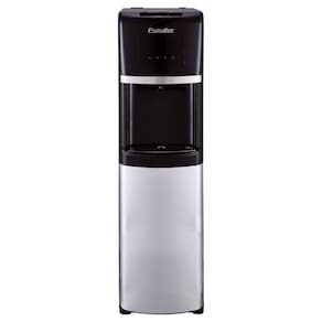 Bebedouro de coluna Esmaltec com compartimento interno para garrafão, água quente, gelada e natural, refrigeração por compressor e design em inox.Água gelada