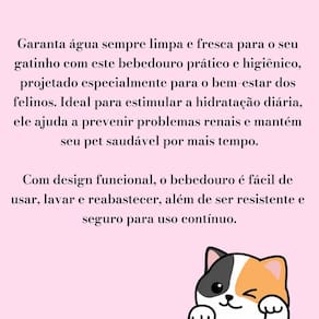 Garanta mais saúde e bem-estar para o seu gato com o Bebedouro Automático Elétrico, especialmente desenvolvido para atrair os felinos a beberem mais água Marca: Não Informado