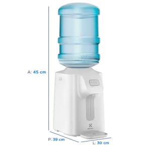 Ficha Técnica Marca:Electrolux Modelo D30EBA Tipo Bebedouro Temperatura de operação Gelada, fria e natural Capacidade do reservatório 1,8 litros Compressor Gás R600a Painel de controle Sim Bandeja removível Sim Pés antiderrapantes Sim Altura 45 cm Largura 30 cm Profundidade 39 cm Peso 9,5 kg Potência 75w Consumo 8.88kWh/mês Frequência 60 Hz