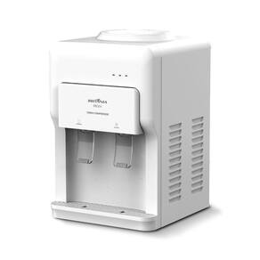 Bebedouro elétrico de mesa com água natural (16C) e gelada (6C a 12C). Compatível com galões de 10 e 20 litros. Sistema de refrigeração por compressor com serpentina interna. Bandeja coletora removível. Sistema Easy Clean. Luz indicadora de funcionamento e LED azul para água gelada.Água gelada