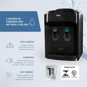 O Bebedouro EOS Mineralle EBE01 de mesa é leve e compacto. Possui design moderno e sistema eletrônico de refrigeração com baixíssimo consumo de energia, silencioso e sem vibração. Ele conta com Sistema Abre Fácil através de um perfurador que faz da troca do galão uma tarefa muito fácil e prática. Oferece temperatura para todos os gostos: você pode escolher entre água gelada ou natural.