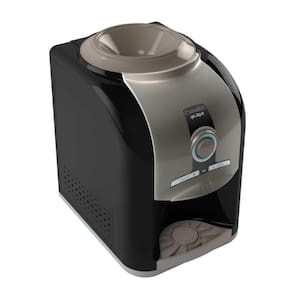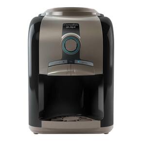 Bebedouro Esmaltec de mesa para garrafão, com refrigeração por compressor, termostato frontal para controle gradual de temperatura (5°C a 15°C), sistema Easy Open para lacre do garrafão, função Mix para água gelada e natural, e aparador de água removível.Água gelada