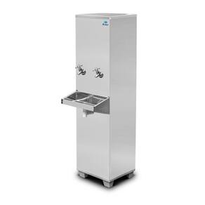 Bebedouro industrial de coluna Frisbel com capacidade de 25 litros, duas torneiras (água gelada e natural) e acabamento em inox. Ideal para escritórios, escolas e indústrias.Água gelada