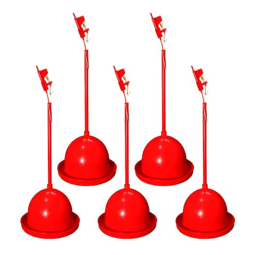 Kit Bebedouro pendular automático aves 5 unidades. Válvula pendular GRT para dosagem precisa da água. Gancho para facilitar a vacinação. Cúpula pendular injetada em polipropileno aditivado com 0,02% uv. Cor vermelha atrativa para as aves. Robusto e com peso ideal para garantir estabilidade. Calha inclinada para dentro proporcionando cama de frango mais seca. Capacidade para 80 a 100 aves cada. Tamanho do cabo: 0,50 cm. Kit com 5 unidades. Marca: Sgamaq. Marca: Não Informado Ean: 7909389275814
