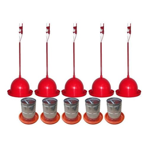 Bebedouro Pendular + Comedouro 5kg Aves kit Com 5 De Cada Kit contendo 5 unidades de Bebedouro Pendular para Aves + 5 unidades de Comedouro Galvanizado Prato Plástico Para Aves 5kg. ATENÇÃO Devido ao limite de peso e dimensões dos Correios, só é possível enviar 1 kit por pedido, ou seja, se deseja comprar mais de uma unidade deste kit gentileza realizar as compras separadamente. Bebedouro: Adequado para todo período de alojamento das aves; É equipado com Válvula pendular GRT que proporciona precisão na dosagem da água, contém um gancho para vacinação; A cúpula pendular GRT injetada em polipropileno, aditivado com 0,02% UV contra raios ultravioletas, o que garante maior durabilidade; A cor vermelha torna-se mais atrativa para as aves; Robusta e com peso ideal para melhor estabilidade do bebedouro; Possui calha com pequena inclinação voltada para dentro,proporcionando uma cama de frango mais seca; Capacidade para 80 aves cada; Tamanho do cabo: 0,50cm cada. Comedouro: Conhecido como comedouro suspenso, Utilizado por sitiantes em aviários, tubo galvanizado, base prato plástico vermelho; Volume 5kg de ração ou milho; Possui regulagem na travessa superior em conjunto com a haste; O prato com 26 x 26 Cm é injetado com material 100% puro virgem PP H 103 com 0,02% UV contra raios ultravioletas; Altura Total 26 Cm; Fácil acesso das aves ao alimento; Peso: 630g cada. Ean: 7800890626730
