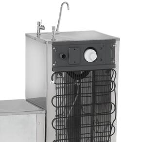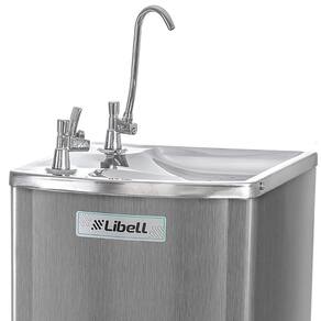 Bebedouro purificador de coluna Libell Kromanox Press Side com sistema de tripla filtragem, gabinete em aço Kromanox, pia em aço inox polido, torneiras cromadas, refrigeração por compressor e controle de temperatura ajustável.Água gelada