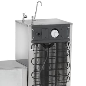 Bebedouro purificador de coluna conjugado Kromanox Libell com sistema de tripla filtragem, gabinete em aço Kromanox, pia em aço inox polido, torneiras cromadas, reservatório em poliacetal atóxico, refrigeração por compressor e termostato regulável.Água gelada