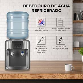 Bebedouro refrigerado eletrônico para galão de 10 a 20 litros, com refrigeração eletrônica, duas torneiras (água natural e gelada), e bandeja coletora removível. Ideal para uso doméstico.Água gelada