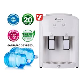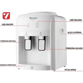 Design compacto, baixo consumo de energia, duas torneiras super-resistentes (natural e gelada), passagem direta do galão para a torneira, dreno para remoção de água acumulada, sistema perfurador para troca de galão, bandeja coletora removível.Função retrolavagem