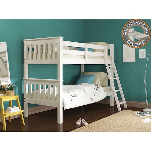 Características Estrutura em madeira ecologicamente correta (Eucalipto). Pintura com acabamento PU. Grade de segurança para a cama superior. Escada removivel. Pode ser desmontada e usada como duas camas de solteiro. Suporta até 95 Kg cada, sem impacto. Acompanha colchão de 188x88cm.