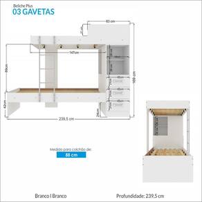 e qualidade. Esta beliche também dispõe de 3 gavetas com corrediças metálicas que deslizam