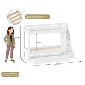 A Beliche Moon é a solução ideal para quem busca otimizar espaços com elegância e funcionalidade. Composta por 3 camas, uma delas sendo uma cama auxiliar com rodízios, é perfeita para quartos adultos que precisam de praticidade no dia a dia. O modelo conta com uma escada lateral que dá acesso à cama superior, projetada com um design inteligente: 2 nichos abertos, 2 portas de abrir e 2 gavetas removíveis oferecendo espaço extra para organização de objetos pessoais, livros ou itens decorativos. Sua estrutura é fabricada em MDP de 1,5cm, com revestimento em BP, garantindo durabilidade, resistência e um acabamento com qualidade de marcenaria. Com um visual moderno e discreto, a Beliche Moon é ideal para ambientes adultos que prezam por conforto, funcionalidade e um toque de sofisticação. Produto Montado: Sim Acabamento da Gaveta: BP Acabamento da Porta: BP Acompanha Cama Auxiliar: Sim Acompanha Colchão: Não Altura do Estrado até o Chão: 33,7 cm Altura do Estrado Superior até o Chão: 136.5000 Altura dos Pés: 1,5 cm Altura Máxima dos Pés: 1.5000 Ambiente Principal: Quarto Cama Auxiliar Acompanha Colchão: Não Cama Auxiliar com Rodízio: Sim Cama Auxiliar Suporta Até (kg): 100 kg codigo_ean: 7900288225757 Complexidade da Montagem: Alta: deve ser montado por um montador especializado Comprimento: 251,6 cm Cor: Branco Cor do Produto: Branco Cor Flex: Não Escala de Brilho: Semi-Brilho Escala de Brilho da Gaveta: Semi-Brilho Escala de Brilho da Porta: Semi-Brilho Gaveta com Chave: Não Informações Complementares: - Fazer uma verificação mensal e realizar o reaperto dos parafusos do produto, caso necessário. - Proibido pular sobre as camas. - O produto destina-se ao uso de uma pessoa por cama sempre. O produto jamais deverá ser utilizado por mais de uma pessoa por cama Itens Inclusos: 1 Treliche, Kit Ferragens e Manual de Montagem Linha ou Coleção: Moon Manual de Montagem e Instalação: https://product-hub-prd.madeiramadeira.com.br/922956861/documents/7b8753f2-1c73-4a5f-be79-262e4e20431e3190944390317574412979904.pdf Marca: Yescasa Material da Gaveta: MDP Material da Porta: MDP Material do Estrado: Madeira Multilaminada Material do Puxador da Gaveta: MDF Material do Puxador da Porta: MDF Material dos Pés: Plástico Material Principal: MDP Montagem Flex: Não Necessita Montagem: Sim Número de Camas: 03 Origem do Produto: Nacional Permite a Utilização de Cama Auxiliar: Sim Peso: 132 kg Peso Máximo por Gaveta: 3 kg Peso Suportado por cada cama: 100 kg Possui Baú: Não Possui Escrivaninha: Não Possui Espelhos: Não Possui Gavetas: Sim Possui Nichos: 04 Possui Pés: 04 Possui Portas: Sim Possui Prateleiras: Não Possui Rodízio: Sim Quantidade de Gavetas: 02 Gavetas Quantidade de Portas: 02 Recomendações de Uso, Manutenção e Limpeza: Limpar com pano umedecido, sem adição de produtos químicos. Rodízio com Trava: Não Sapatas Niveladoras: Não Sistema de Montagem: Profissional Qualificado Tamanho da Cama: Solteiro Tamanho do Colchão Indicado (L x C): 88 x 188 cm Tamanho do Colchão Indicado Cama Auxiliar: 88 x 188 cm Tipo de Cama: Treliche Tipo de Colchão: Solteiro Tipo de Dobradiça/Corrediça da Porta: Metálica Tipo de Estrado: Fixo Tipo de Porta: Abrir Tipo de Puxador da Gaveta: Externo Tipo de Puxador da Porta: Externo Trava de Segurança: Não