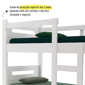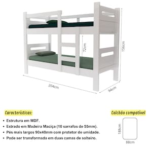 Beliche Amanda pode virar duas camas de solteiro, podendo assim dividir as camas no momento que achar necessário. Possui grade superior e escada fixadas com parafusos passantes, com porcas. Em um dos lados da parte superior a grade é no comprimento total. Própria para colchão de solteiro, de 88cmx188cm - não acompanha o colchão. Características: -Altura total: 156cm. -Largura total: 94cm. -Pés com com protetor de umidade. -Estrutura em MDF - Peso suportado por cama 100kg Acompanha manual com instruções de montagem. Garantia de fábrica: 3 meses. Montagem por conta do comprador Não entregamos na Zona Rural