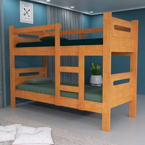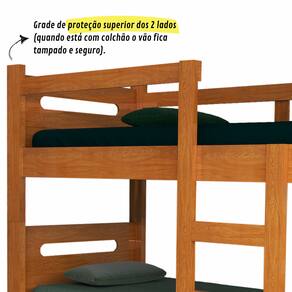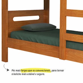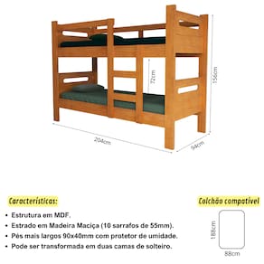 Beliche Amanda pode virar duas camas de solteiro, podendo assim dividir as camas no momento que achar necessário. Possui grade superior e escada fixadas com parafusos passantes, com porcas. Em um dos lados da parte superior a grade é no comprimento total. Própria para colchão de solteiro, de 88cmx188cm - não acompanha o colchão. Características: -Altura total: 156cm. -Largura total: 94cm. -Pés com com protetor de umidade. -Estrutura em MDF - Peso suportado por cama 100kg Acompanha manual com instruções de montagem. Garantia de fábrica: 3 meses. Montagem por conta do comprador Não entregamos na Zona Rural