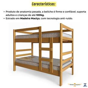 CARACTERÍSTICAS -Suporta 100 Kg em cada cama. -Altura total: 156cm. -Largura total: 94cm. -Pés com com protetor de umidade. -Estrado em madeira, com 5 ripas e 5 travessas cada um. -Acompanha manual com instruções simples e intuitivo.
