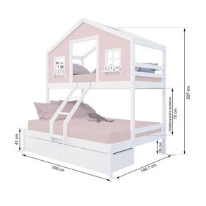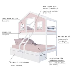 Material Principal: Madeira Maciça | Cor Predominante: Rosa/ Branco | Necessita Montagem: Sim | Acompanha Colchão: Não | Tipo de Cama: Beliche | Altura: 227 | Largura: 146,7 | Comprimento: 199 | Peso: 91 | Peso máximo suportado: 120 e 220 | Cor Via: Rosa/ Branco | Peso com Embalagem: 91 | Comprimento com Embalagem: 192 | Largura com Embalagem: 30 | Altura com Embalagem: 30 | Tamanho da Cama: Beliche Casal/ Solteiro | Descrição do Tamanho: Beliche Casal/ Solteiro | Quantidade de Volumes: 05