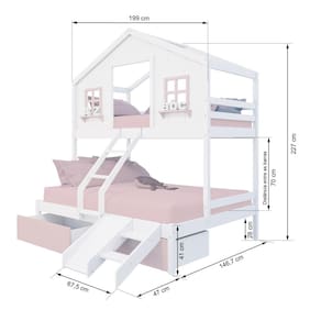 Diferenciais: Escada com Leve Curvatura, Casinha com fechamento em MDF, Janela e Prateleira Decorativa, 02 Gavetas com Rodízios, Kit Escada/ Escorregador.