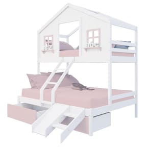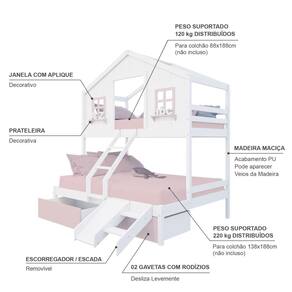 Beliche Casal/ Solteiro Casinha dos Sonhos com 02 Gavetas Rosa Kit Escada/ Escorregador Madeira Maciça Branco/ Rosa Megamobilia