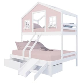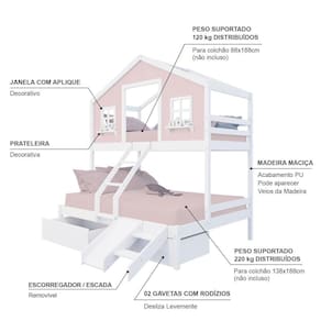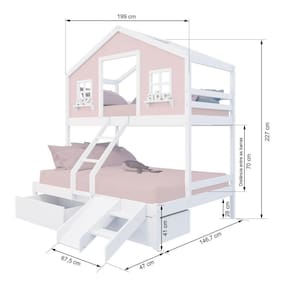 Material Principal: Madeira Maciça | Cor Predominante: Rosa/ Branco | Necessita Montagem: Sim | Acompanha Colchão: Não | Tipo de Cama: Beliche | Altura: 227 | Largura: 146,7 | Comprimento: 199 | Peso: 96 | Peso máximo suportado: 120 e 220 | Cor Via: Rosa/ Branco | Peso com Embalagem: 96 | Comprimento com Embalagem: 192 | Largura com Embalagem: 30 | Altura com Embalagem: 30 | Tamanho da Cama: Beliche Casal / Solteiro | Descrição do Tamanho: Beliche Casal / Solteiro | Quantidade de Caixas: 06