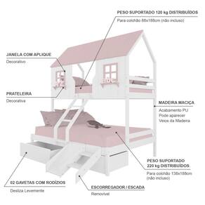 Diferenciais: Escada com Leve Curvatura, Casinha e Telhado com fechamento em MDF, Janela e Prateleira Decorativa, 02 Gavetas, Kit escada/ Escorregador.