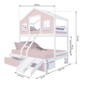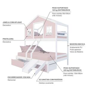Diferenciais: Escada com Leve Curvatura, Casinha com fechamento em MDF, Janela e Prateleira Decorativa, 02 Gavetas com Rodízios, Kit Escada/ Escorregador.