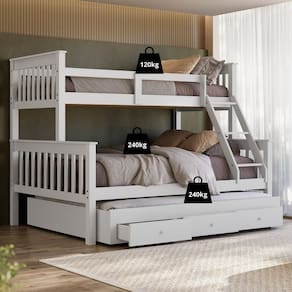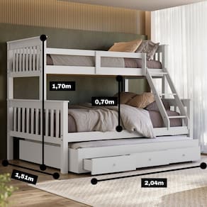 Material: Madeira Maciça de Pinus de Reflorestamento e MDF de 2,2cm de Espessura. Pintura/Acabamento: Laca Branco/Castanho 30% de Brilho, Podendo Aparecer os Veios da Madeira Medidas das Gavetas: A: 17 cm - L: 60 cm - P: 53,5 cm Medidas dos Colchões da Cama de Solteiro (cm x cm x cm): 188x88x20 (Não Incluso) Medidas dos Colchões da Cama de Casal (cm x cm x cm): 188x138x18 (Não Incluso) Medidas dos Colchões da Cama Auxiliar de Casal (cm x cm x cm): 188x138x15 (Não Incluso) Peso Suportado Cama de Solteiro: 120 Kg Peso Suportado Cama de Casal: 240 Kg Peso Suportado Cama Auxiliar de Casal: 240 kg Acessórios: Escada Fixa e Cama Auxiliar (com rodízios) Altura entre camas: 70cm