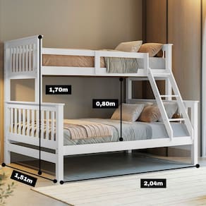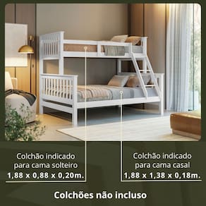 Modelo: B105 Material: Madeira Maciça de Pinus de Reflorestamento e MDF de 2,2cm de espessura Pintura/Acabamento: PU e UV 30% brilho Medidas dos Colchões da Cama de Solteiro (cm x cm): 188x88x20 (Não Incluso) Medidas dos Colchões da Cama de Casal (cm x cm): 188x138x18 (Não Incluso) Peso Suportado Cama de Solteiro: 120 Kg Peso Suportado Cama de Casal: 240 Kg Acessórios: Escada Fixa Altura entre camas: 86cm