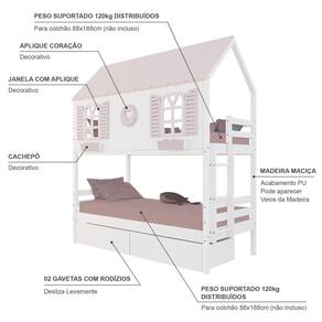 Material Principal: Madeira | Cor: Branco | Rosa | Necessita Montagem: Sim | Acompanha Colchão: Não | Tipo de Cama: Beliche Solteiro Casinha